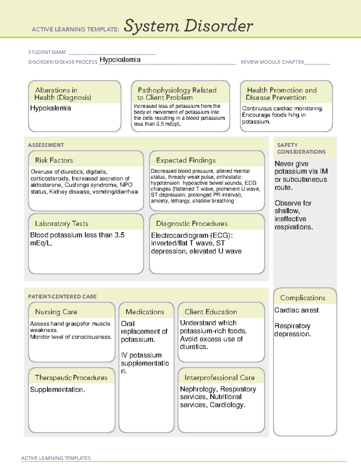 System Disorder Hypokalemia ACTIVE LEARNING TEMPLATES System