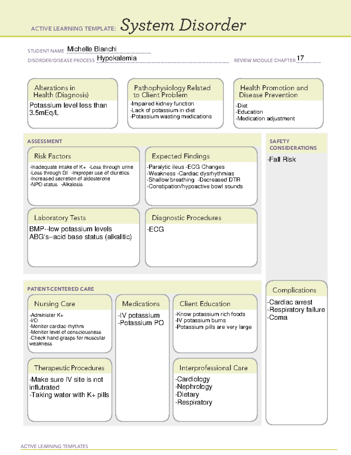 Hypokalemia n/a ACTIVE LEARNING TEMPLATES System Disorder STUDENT