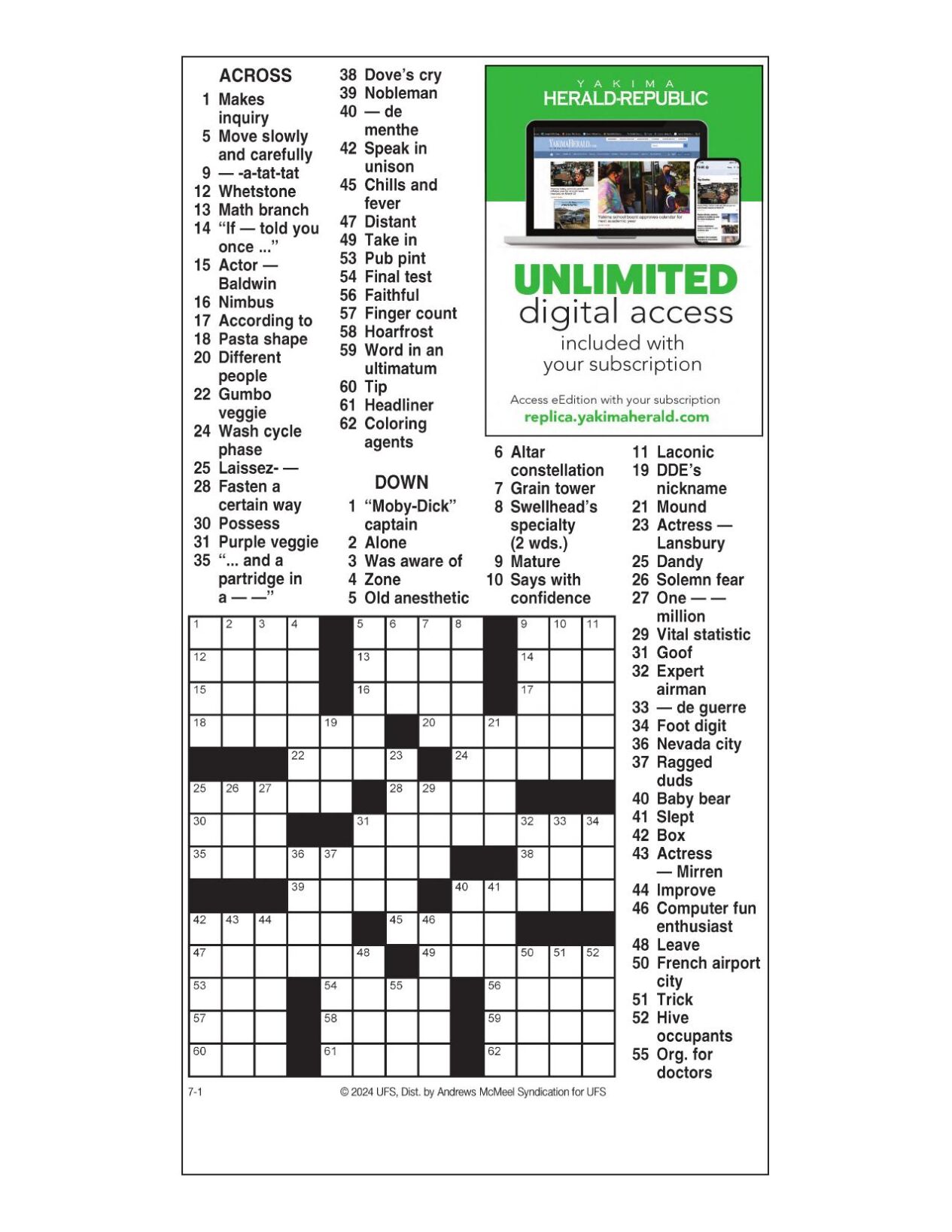 AM Crossword: July 1 2024 Crosswords yakimaherald com