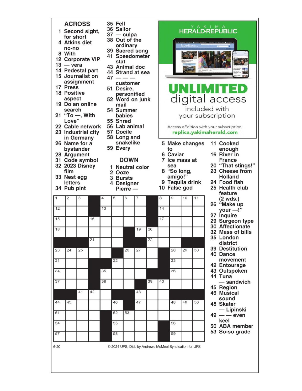 AM Crossword: June 20 2024 Crosswords yakimaherald com