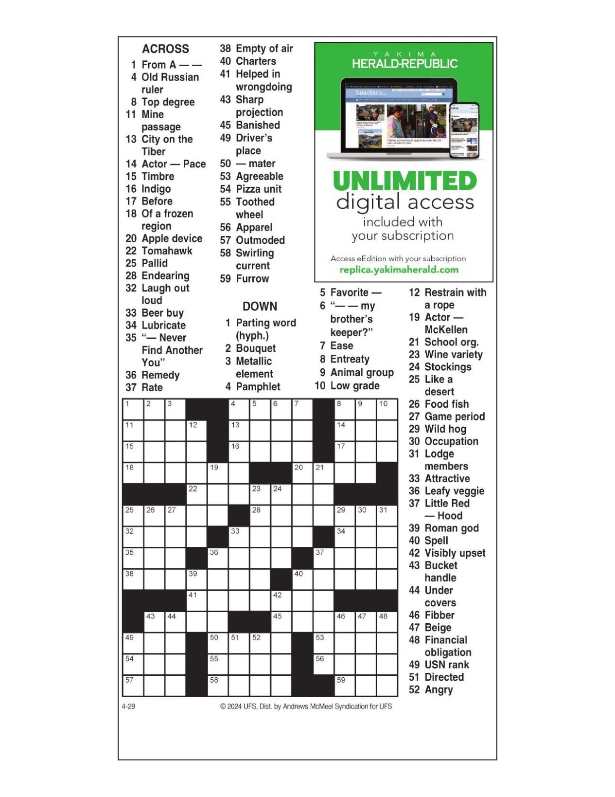 AM Crossword: April 29 2024 Crosswords yakimaherald com