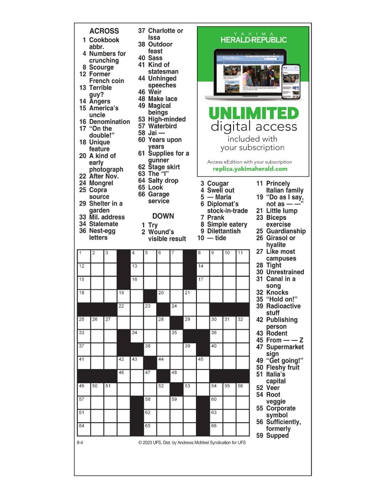 AM Crossword: Aug 4 2023 Crosswords yakimaherald com