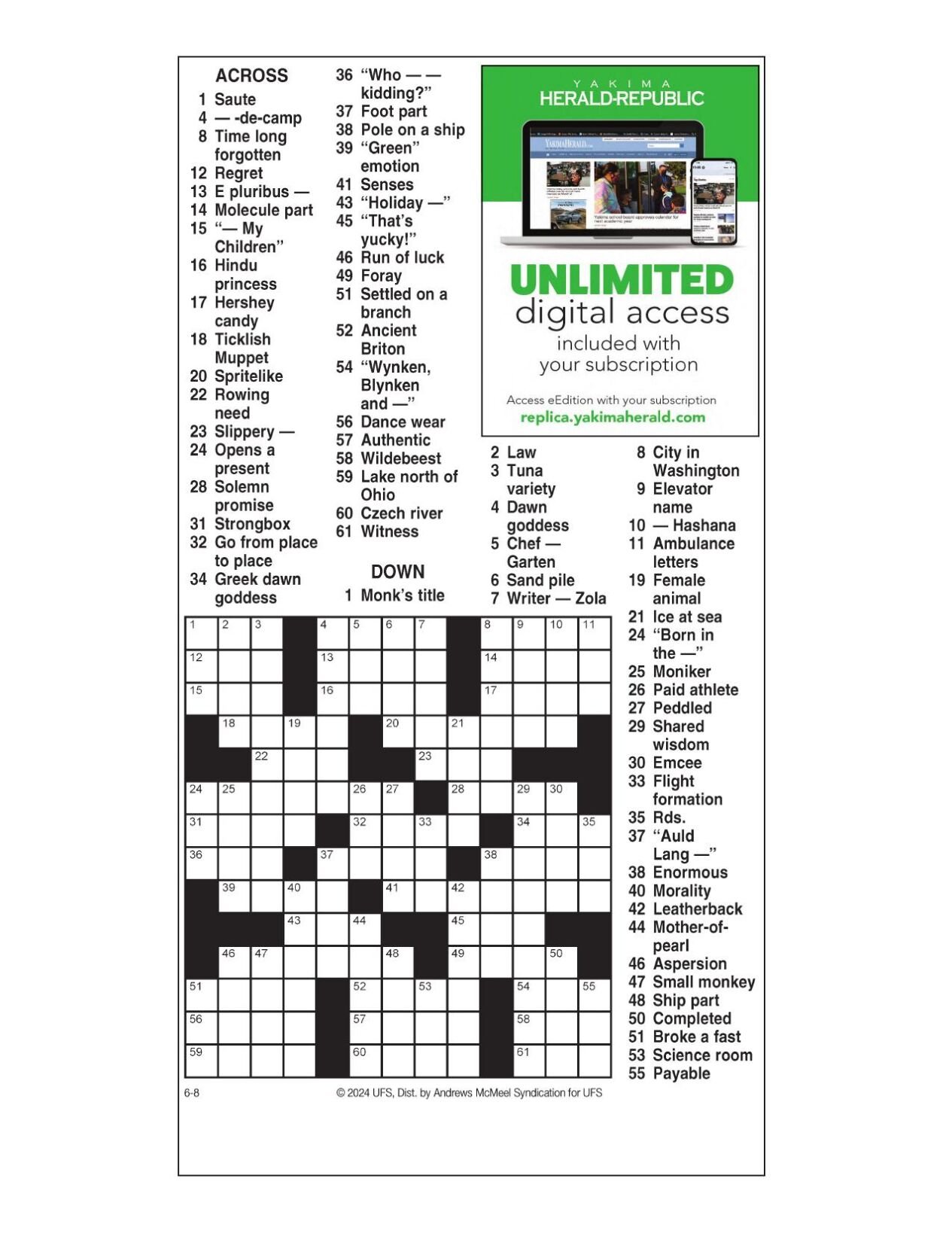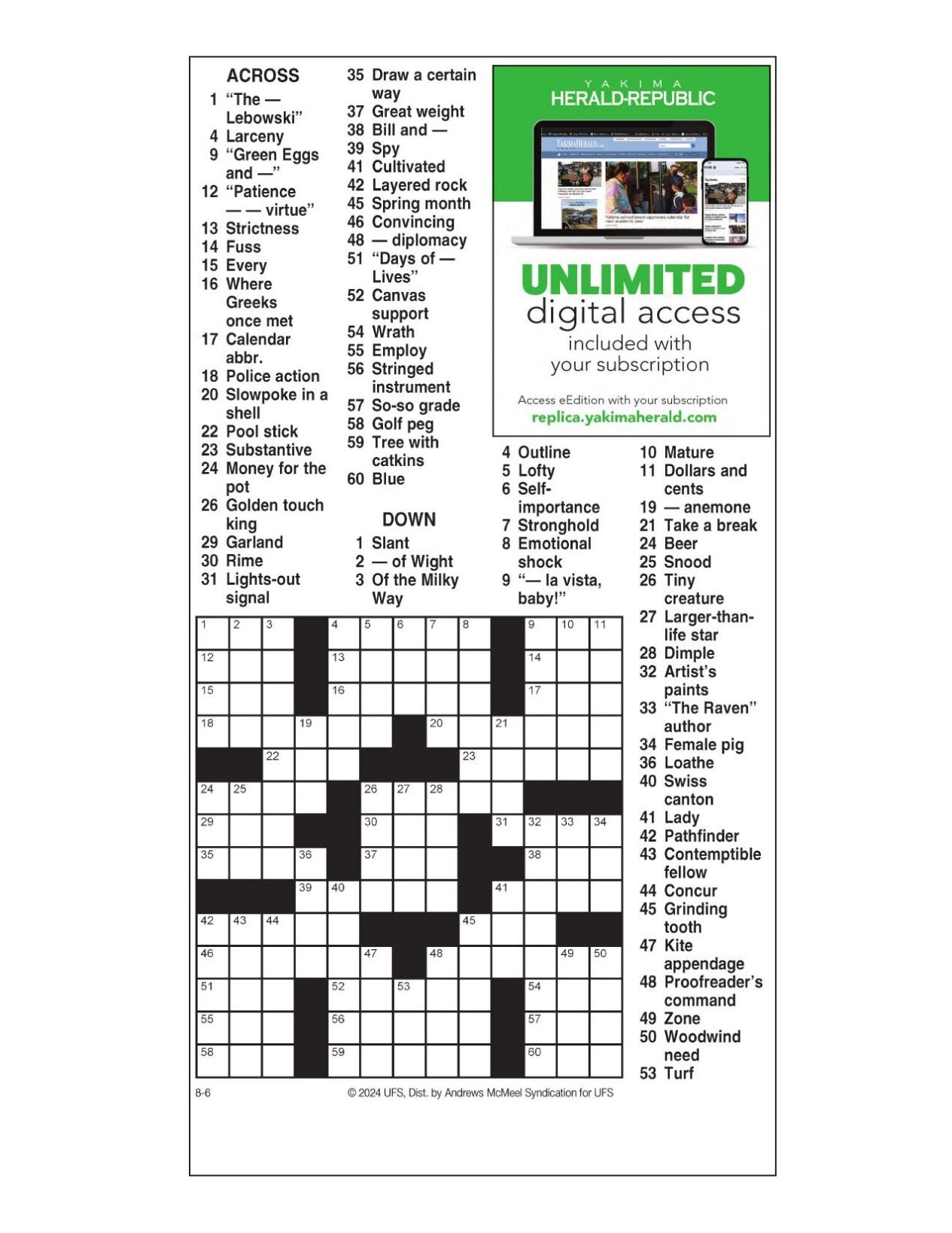 AM Crossword: Aug 6 2024 Crosswords yakimaherald com