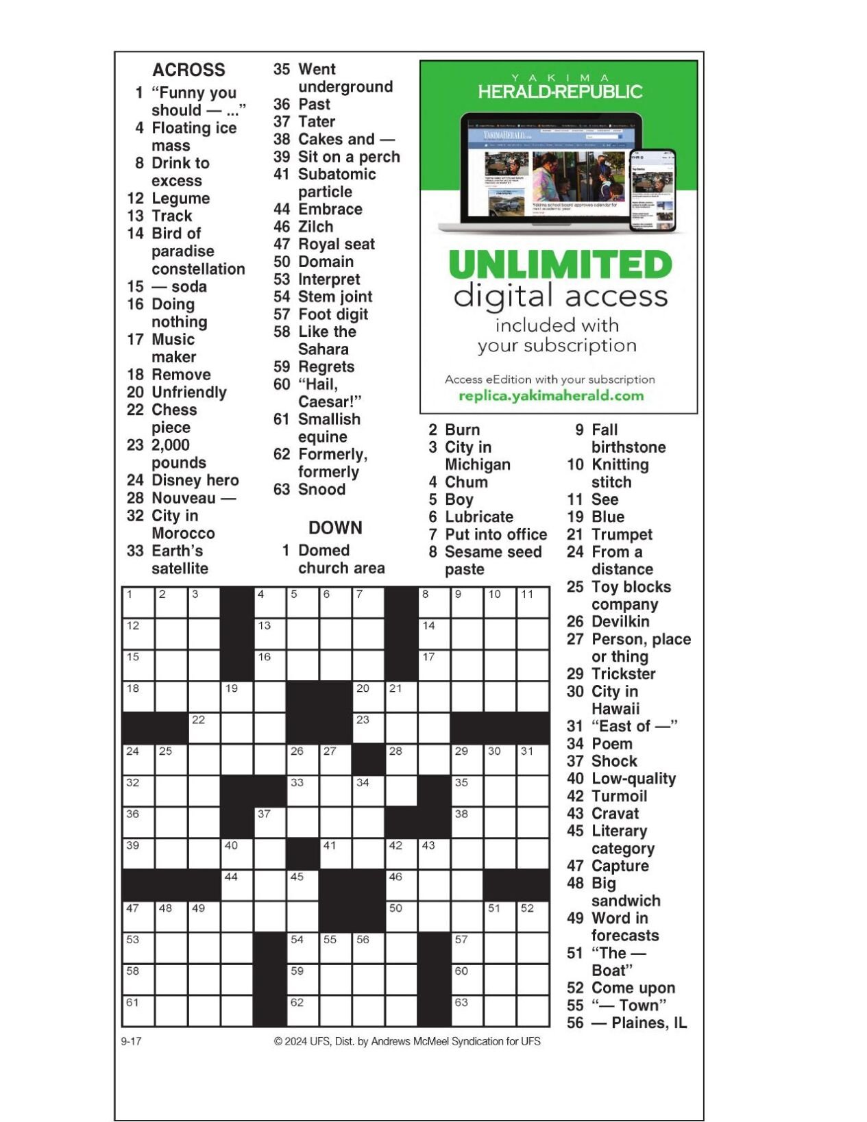 AM Crossword: Sept 17 2024 Crosswords yakimaherald com