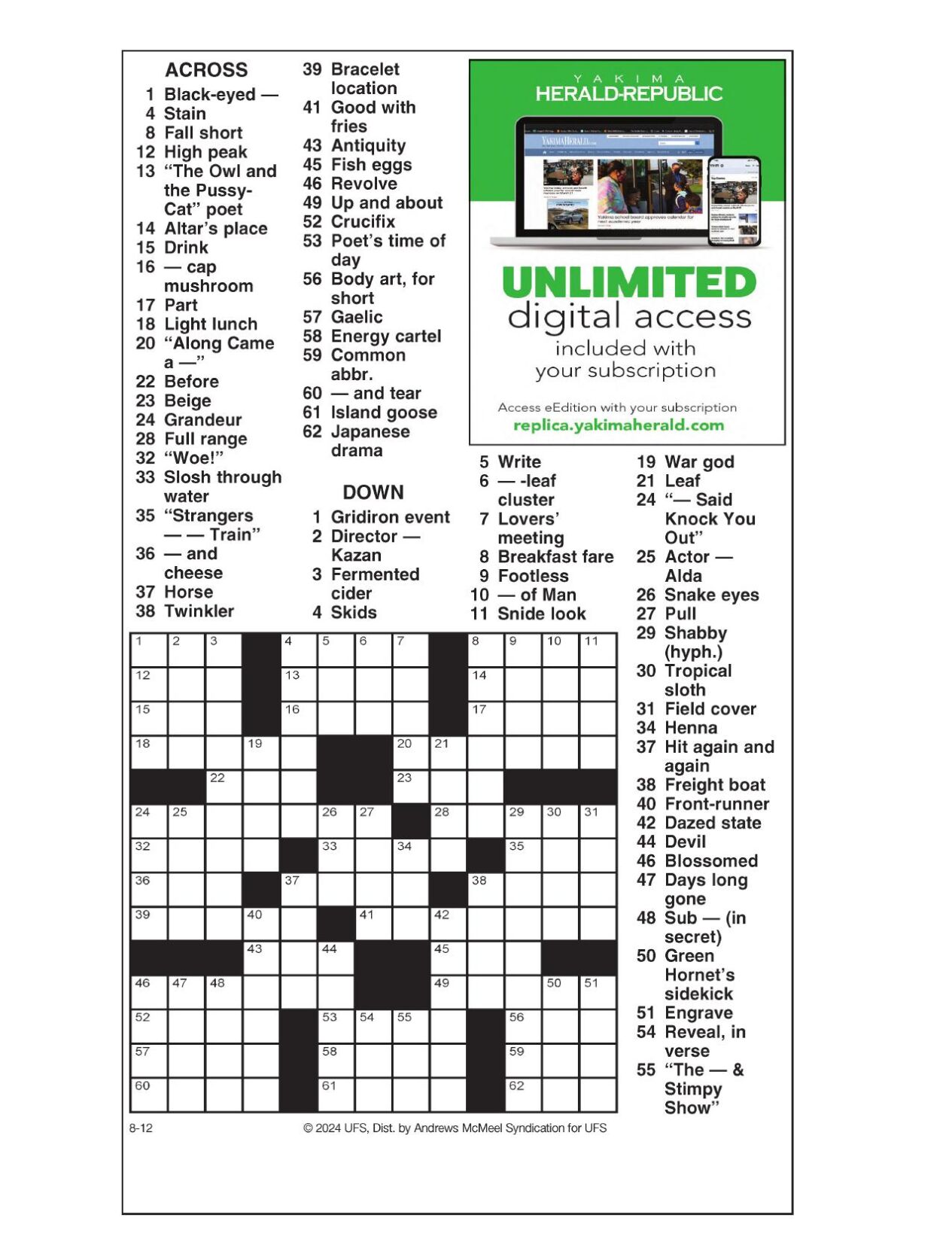 AM Crossword: Aug 12 2024 Crosswords yakimaherald com