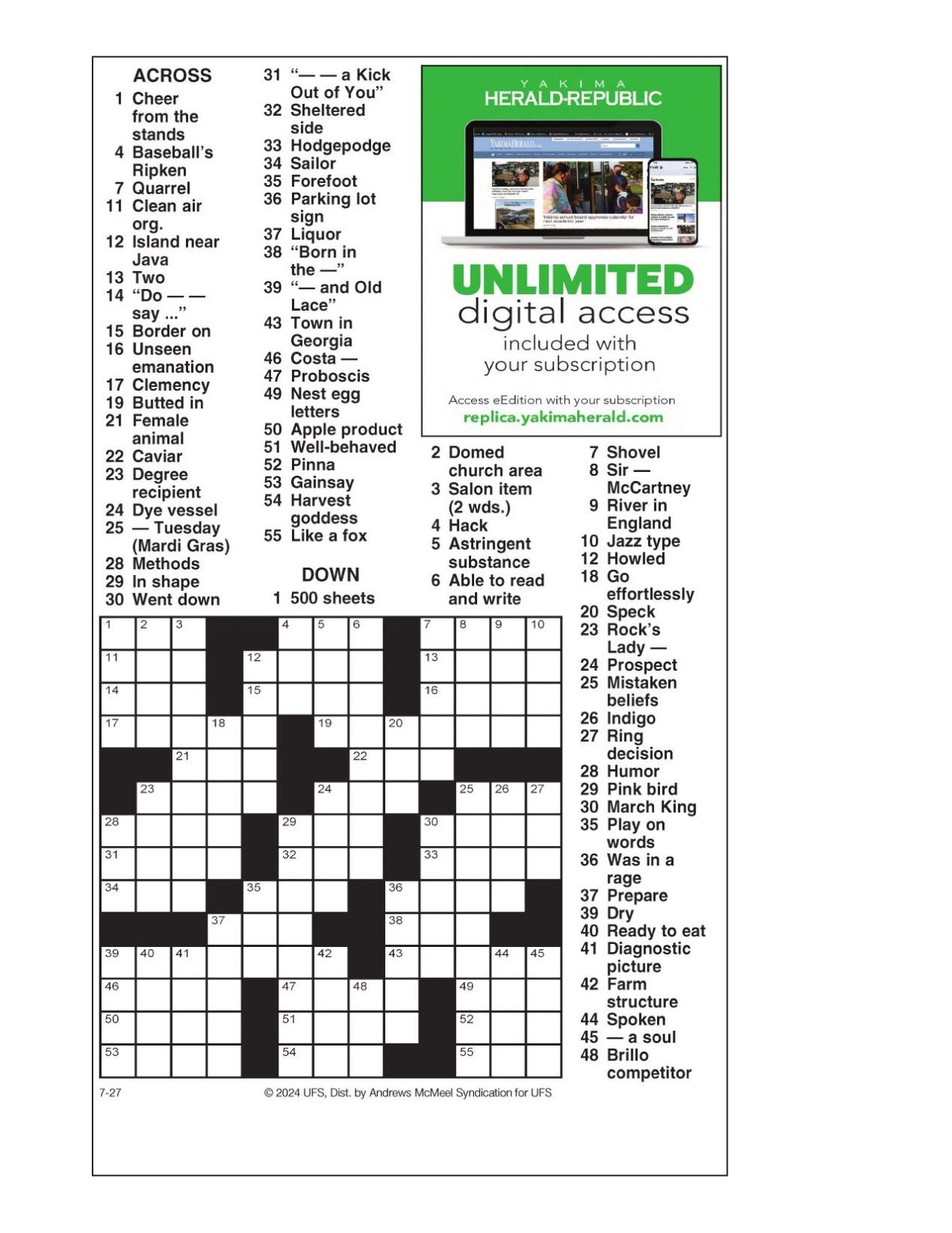 AM Crossword: July 27 2024 Crosswords yakimaherald com