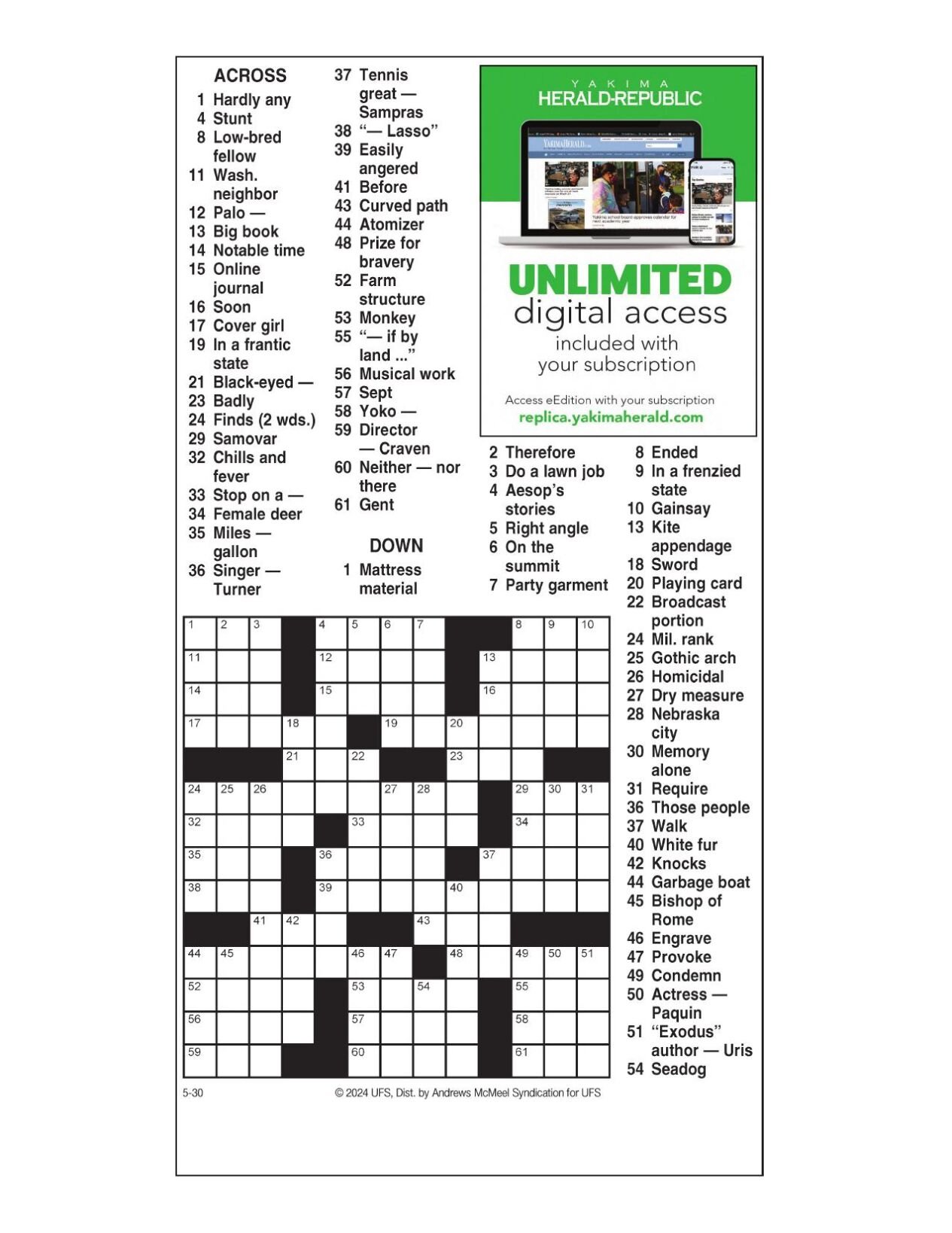 AM Crossword: May 30 2024 Crosswords yakimaherald com