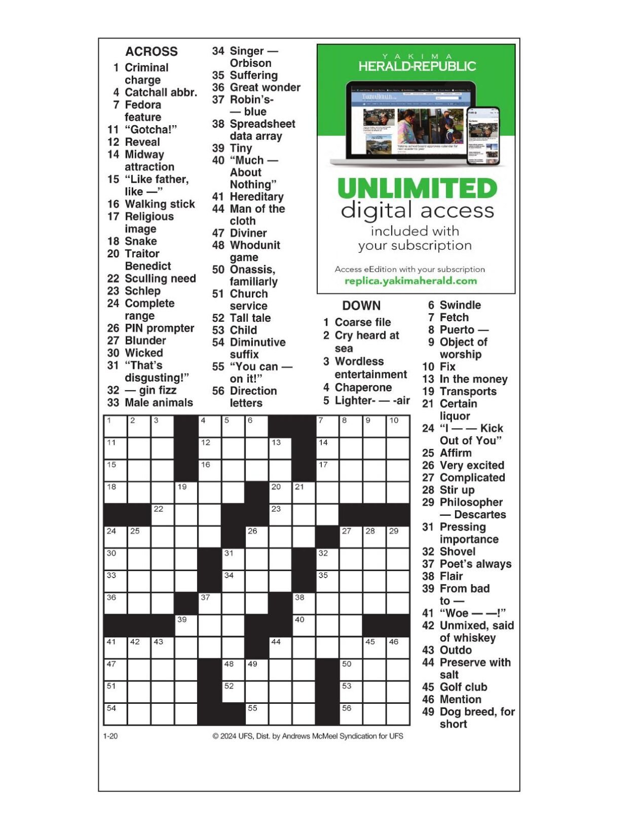 AM Crossword: Jan 20 2024 Crosswords yakimaherald com