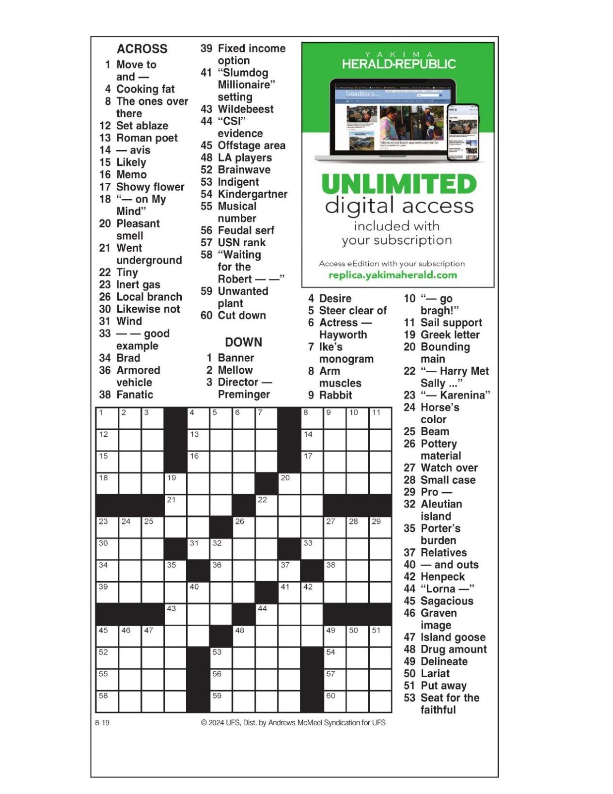 AM Crossword: Aug 19 2024 Crosswords yakimaherald com