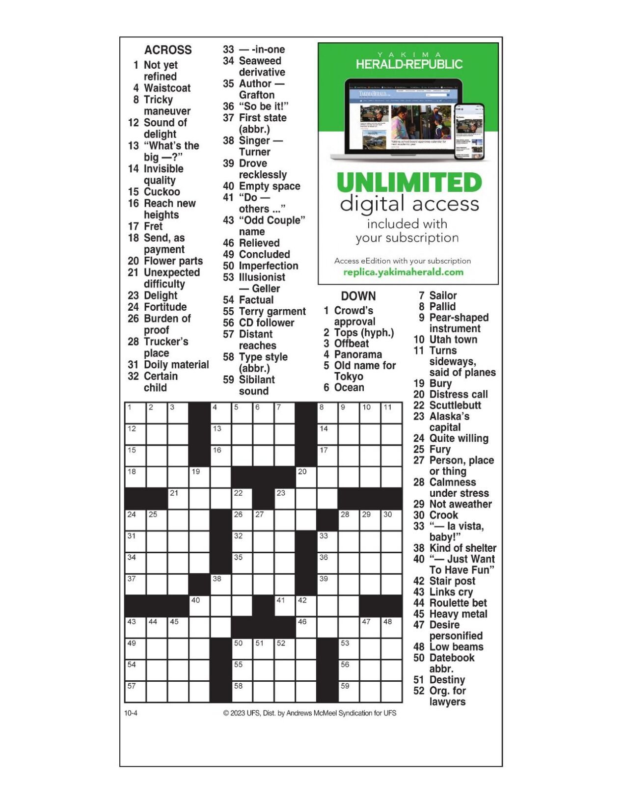 AM Crossword: Oct 4 2023 Crosswords yakimaherald com