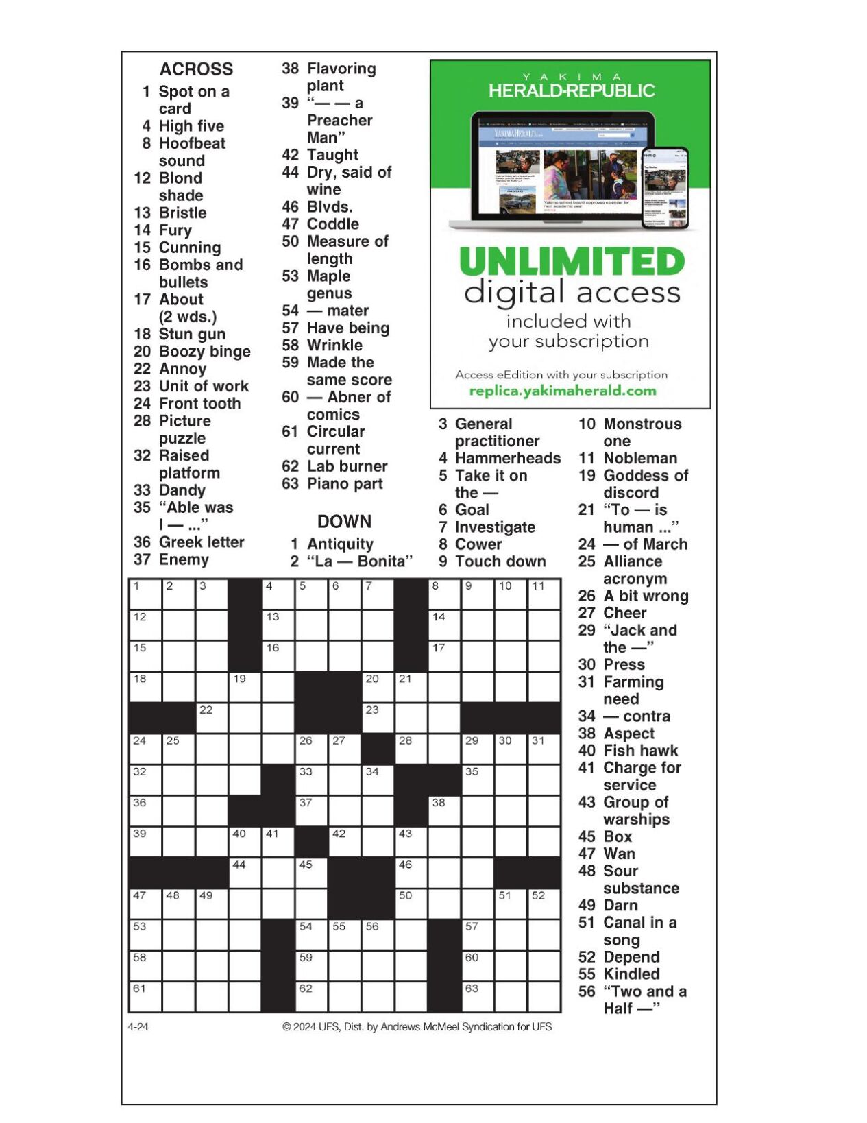 AM Crossword: April 24 2024 Crosswords yakimaherald com
