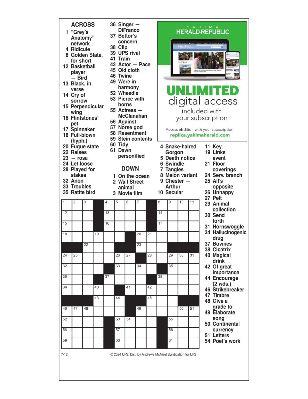 AM Crossword: July 12 2024 Crosswords yakimaherald com