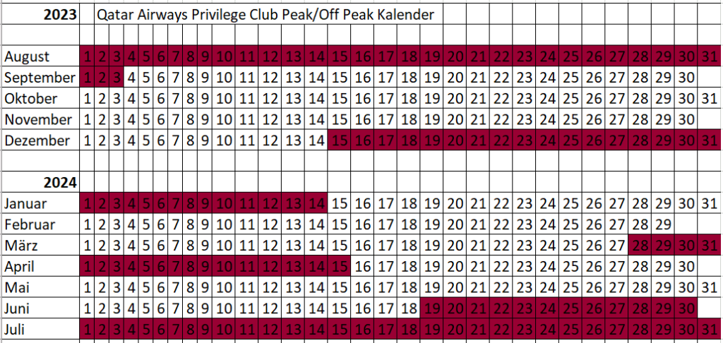 British Airways Iberia Qatar Peak Off Peak Kalender