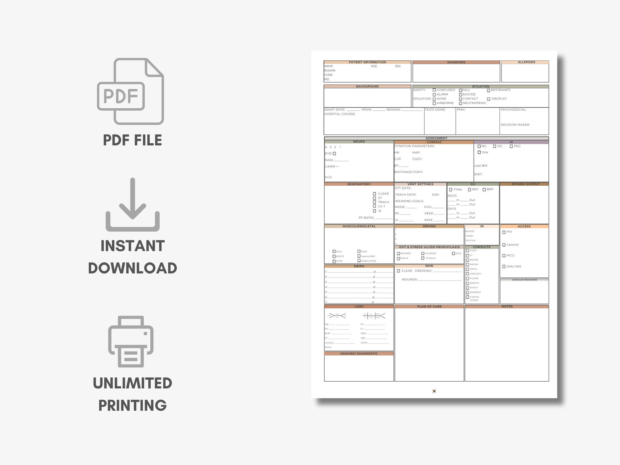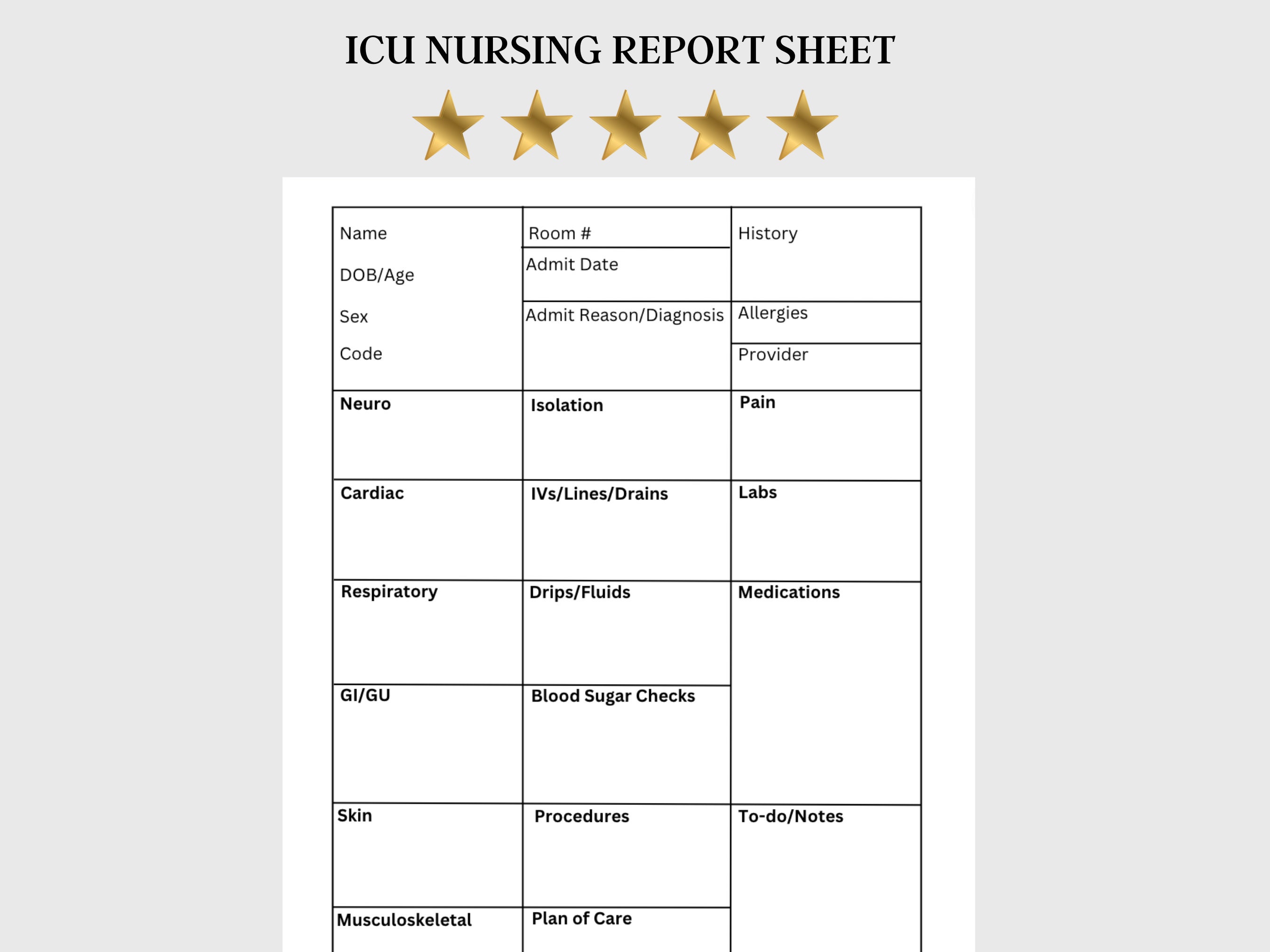 ICU Nurse Report Sheet Printable ICU Nurse Organization Nurse Brain