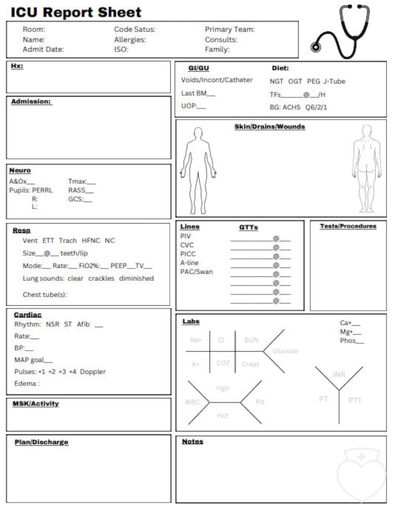 ICU Nurse Sheet ICU Report Sheet RN Nursing New Grad Patient