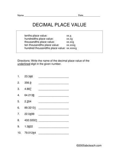 5th Grade Decimal Place Value Worksheets prntbl