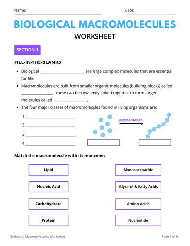 Biological Macromolecules Worksheet Summary Sheet for High School