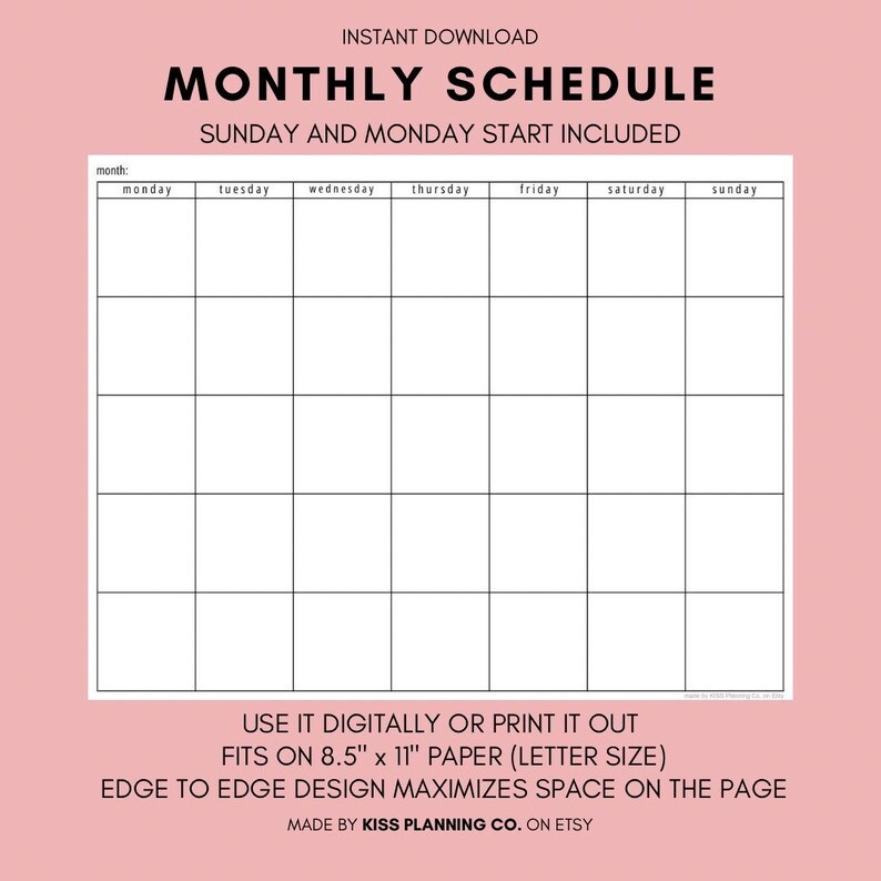 Monthly Calendar Printable/digital Template Etsy