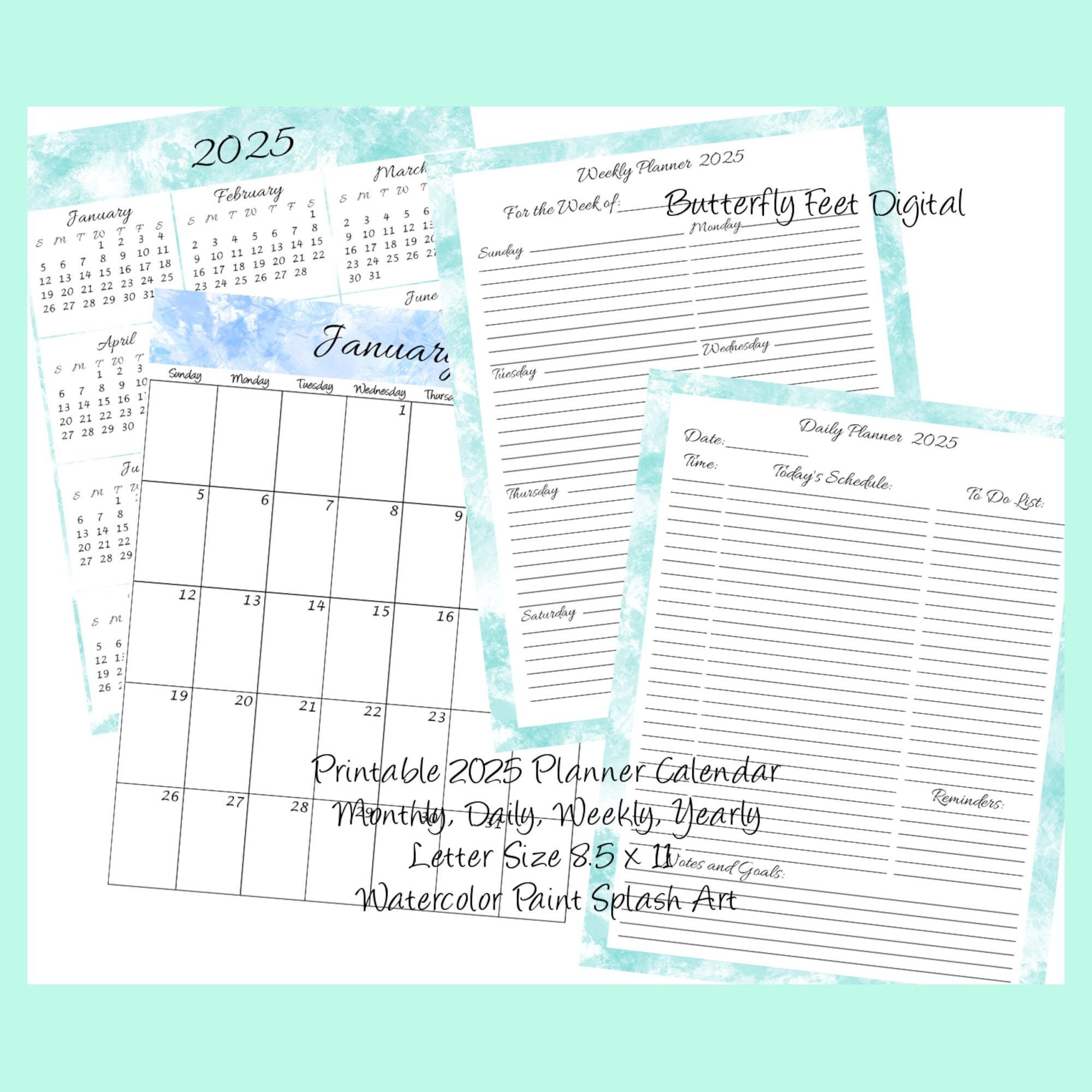 Printable 2025 Planner Calendar Monthly Weekly Yearly Daily Watercolor