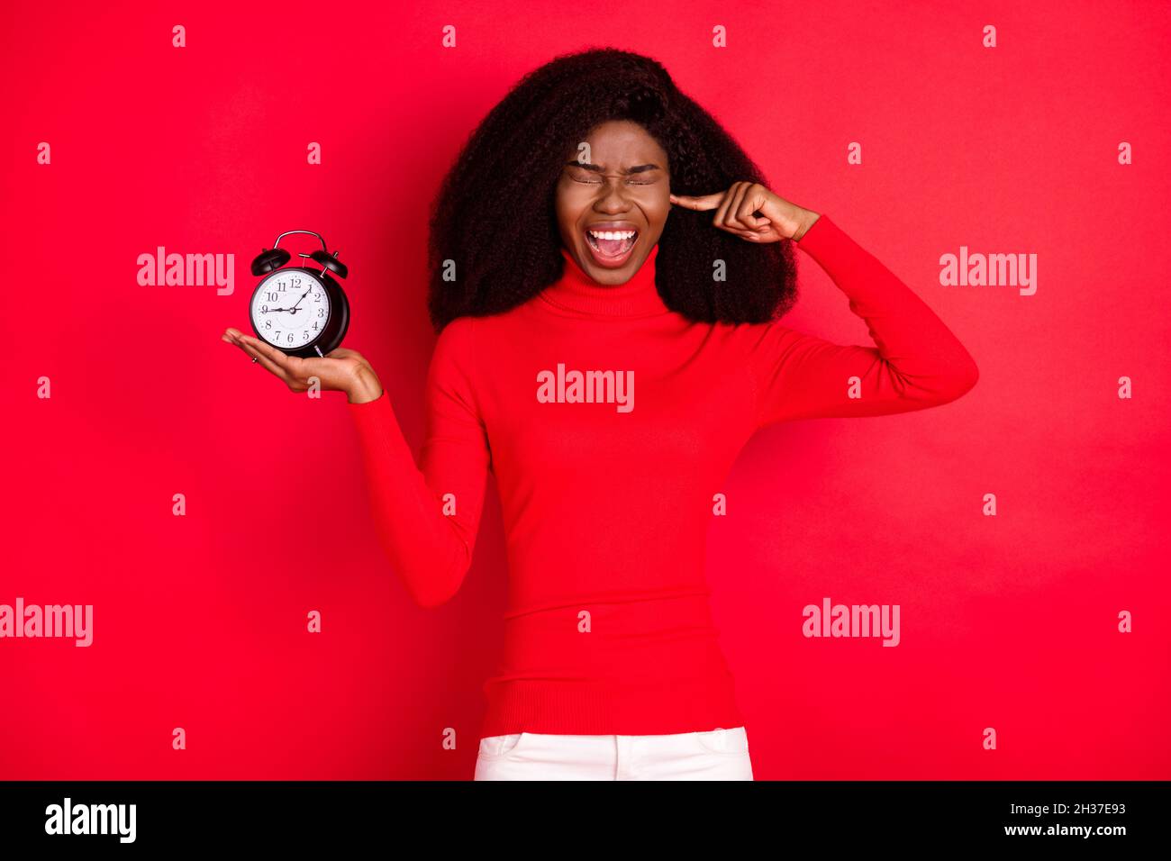 Photo of young black woman ignore avoid hold clock alarm close ear