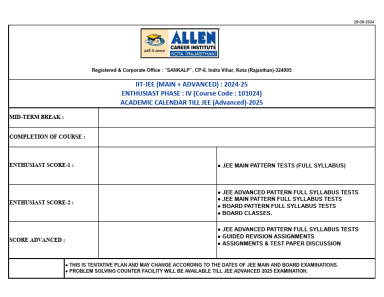 IIT JEE (MAIN ADVANCED) : 2024 25 ENTHUSIAST PHASE: IV (Course Code