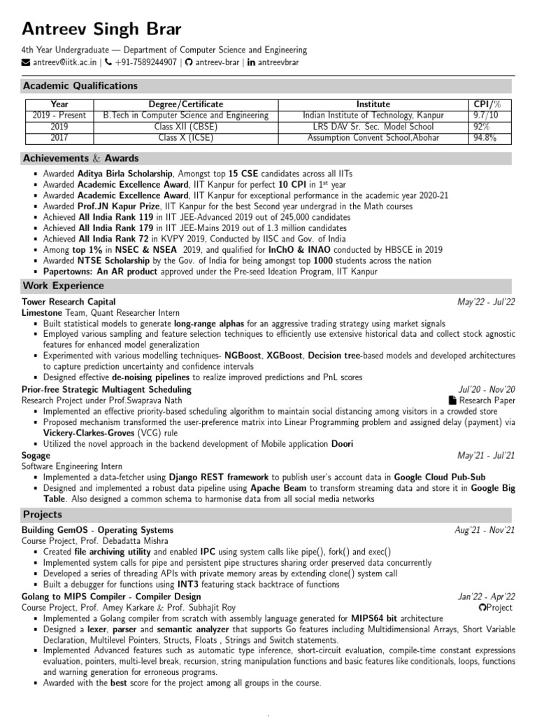 Iit Madras Resume Template 2 Page PDF Deep Learning Computer Science