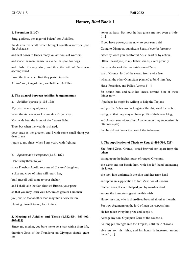 W5 Iliad 1 Handout PDF Iliad Achilles