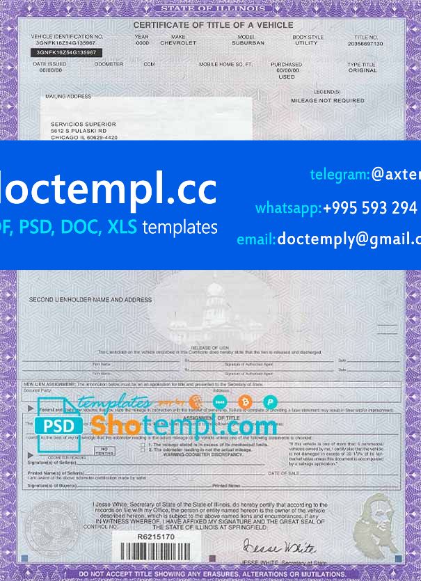 USA state Illinois certificate of title of a vehicle example in PSD