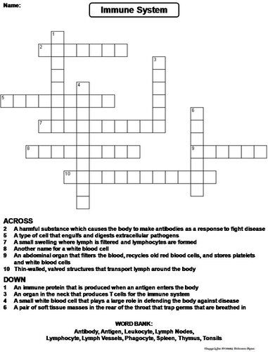 Immune System Crossword Puzzle Printed Name