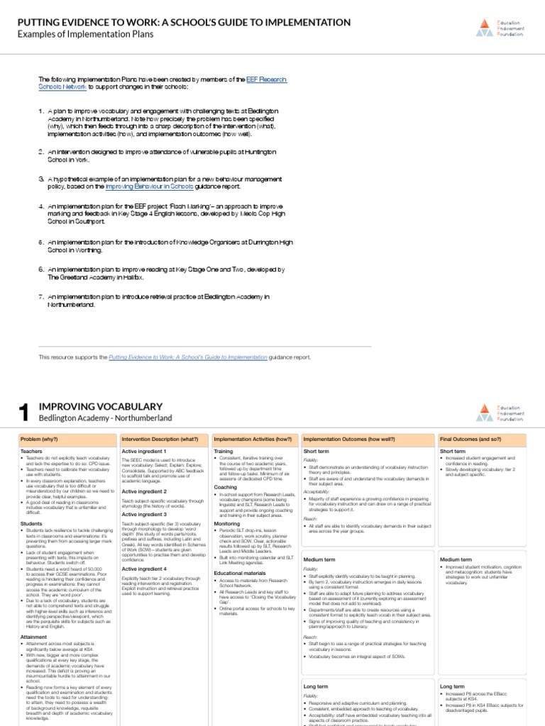 EEF Example of Implementation Plans PDF Curriculum Teachers