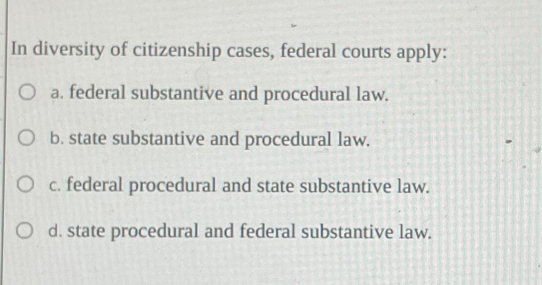 Solved In diversity of citizenship cases federal courts Chegg com