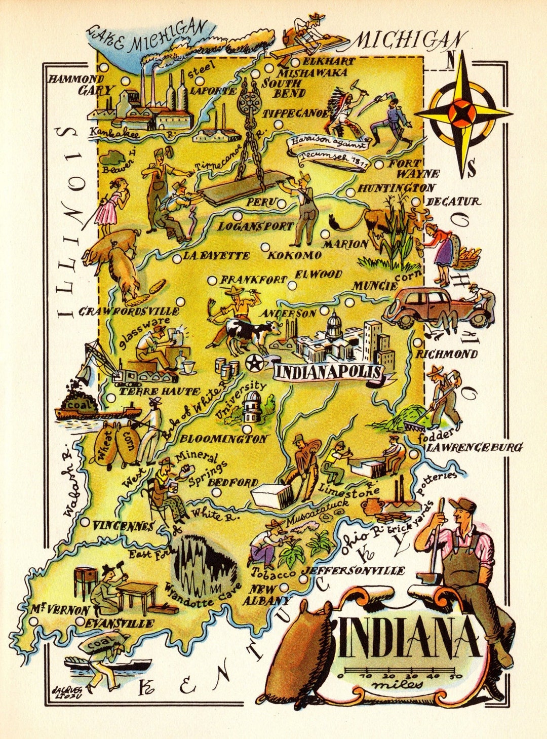 1940 #39 s INDIANA State Map Animated Map of Indiana Print Gallery Wall Art