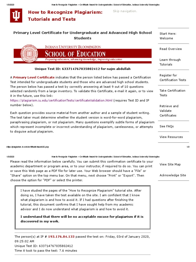 indiana university confirmation certificate on recognizing plagiarism