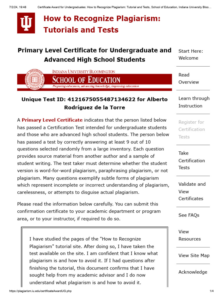 Indiana University Confirmation Certificate on Recognizing Plagiarism