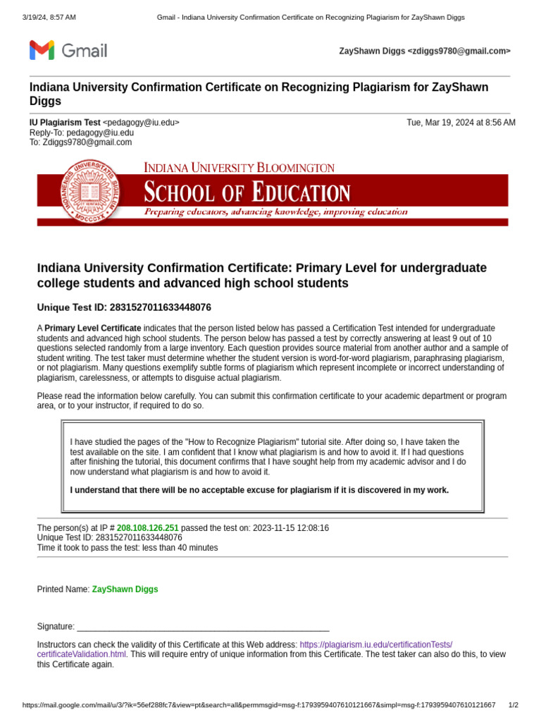 Indiana University Plagiarism Certificate prntbl