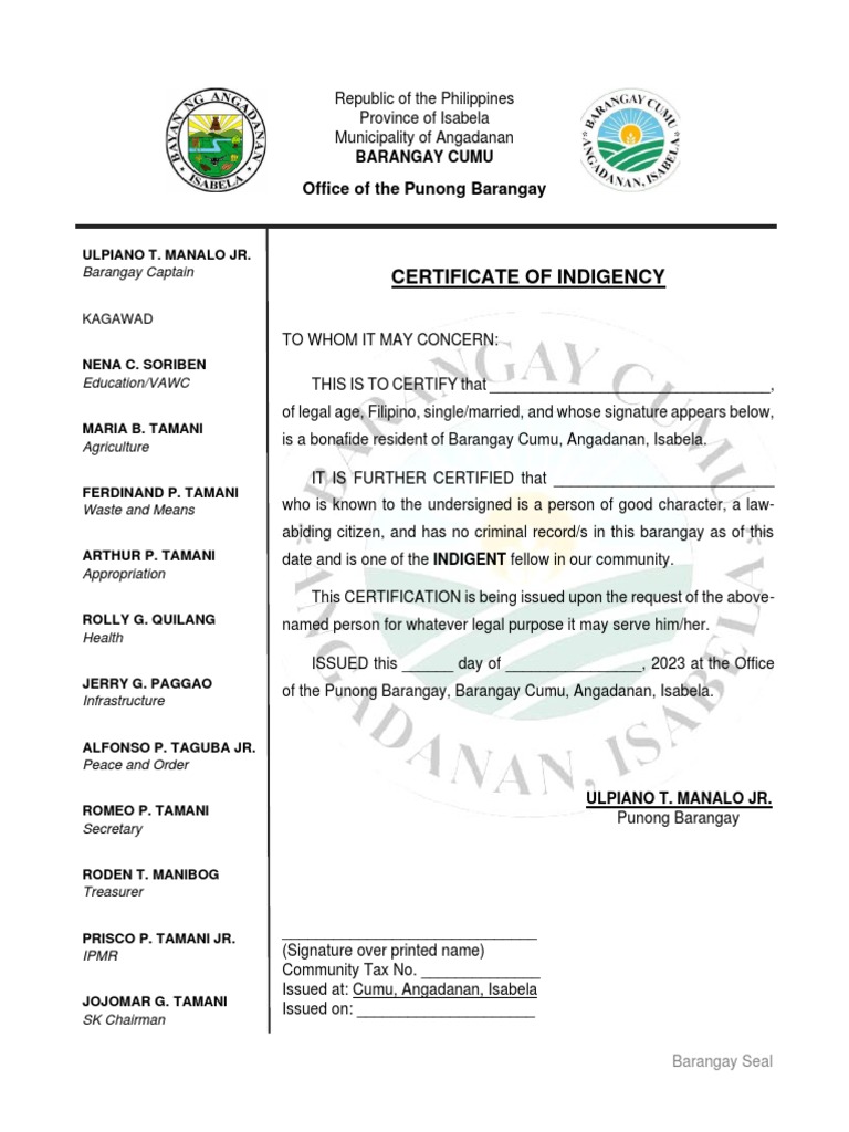 Template 5 BARANGAY INDIGENCY LAY OUT Republic of the Philippines
