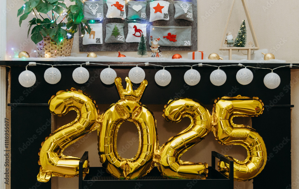 Golden inflatable numbers 2025 and advent calendar on the fireplace