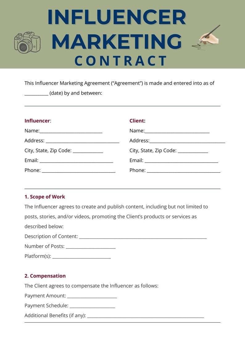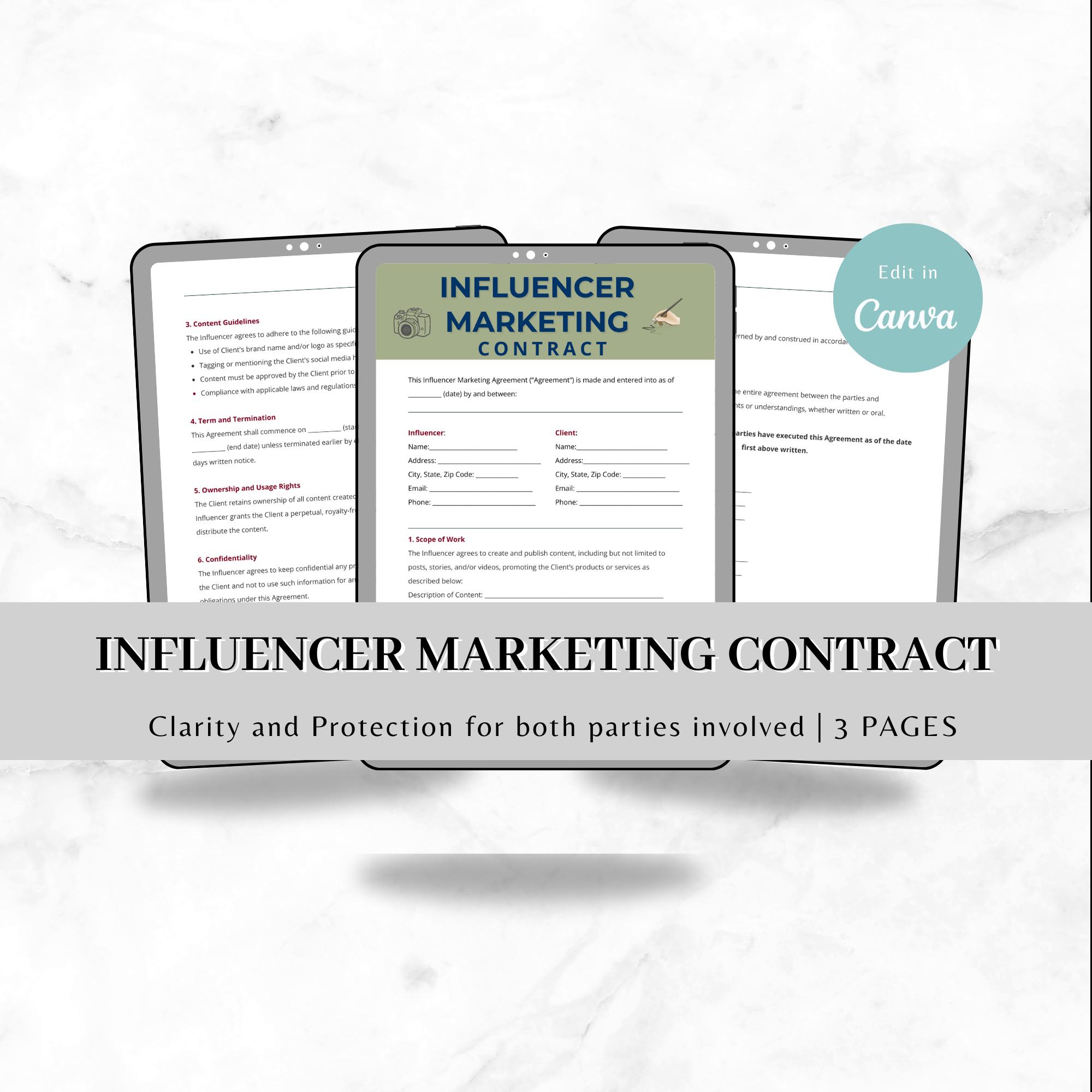 Influencer Marketing Contract Template Agreement Etsy