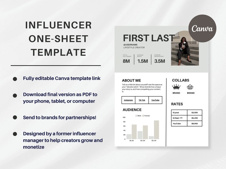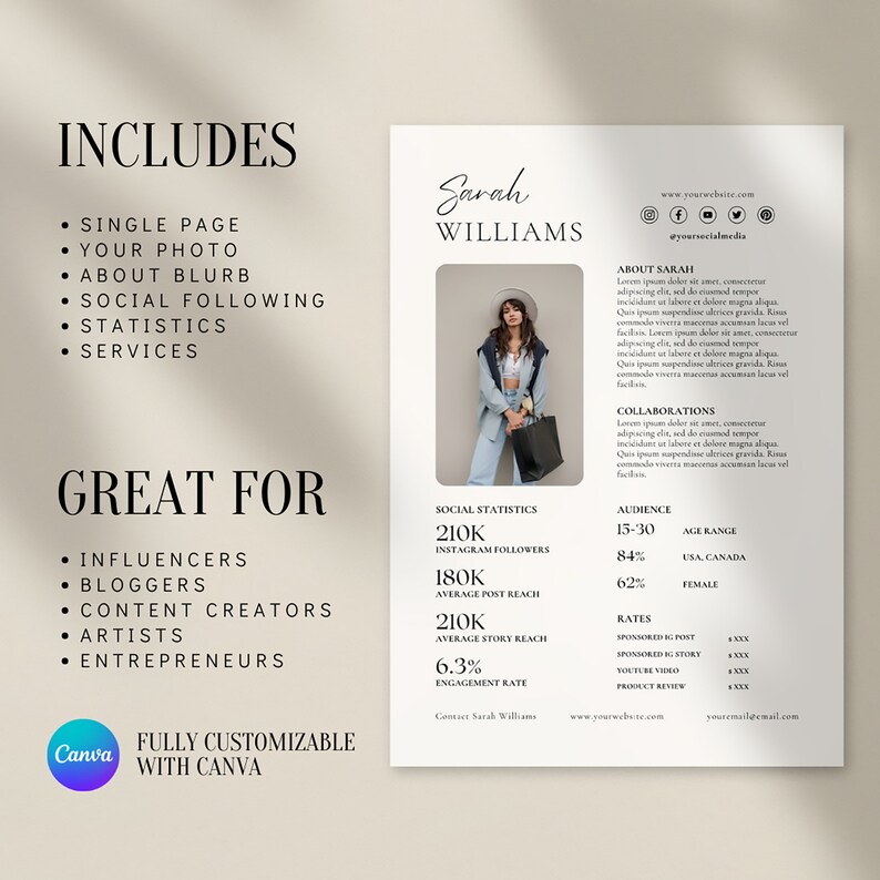 Influencer One Sheet Rate Card Media Kit Customizable Canva Template