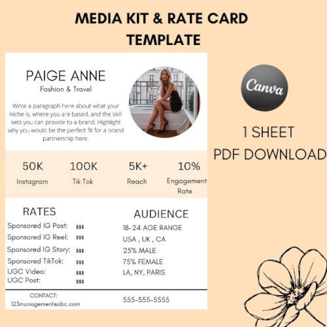1 Page Media Kit Rate Card Template Influencer Content Creator