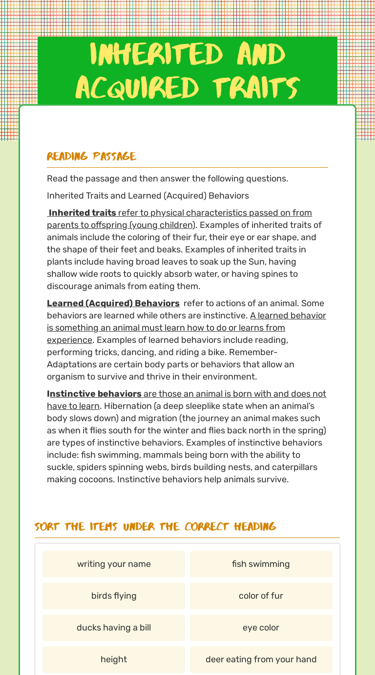 Acquired vs Inherited Traits worksheet Live Worksheets Worksheets