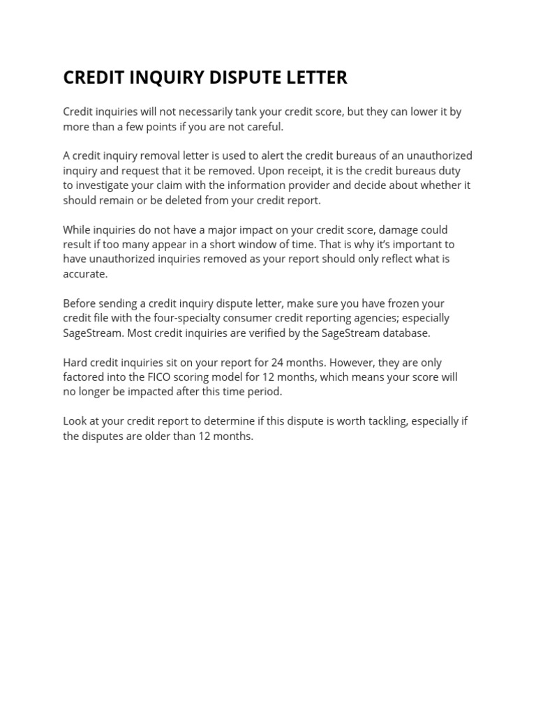 Letter Template For Credit Inquiry Dispute Free Samples in PDF Letterin