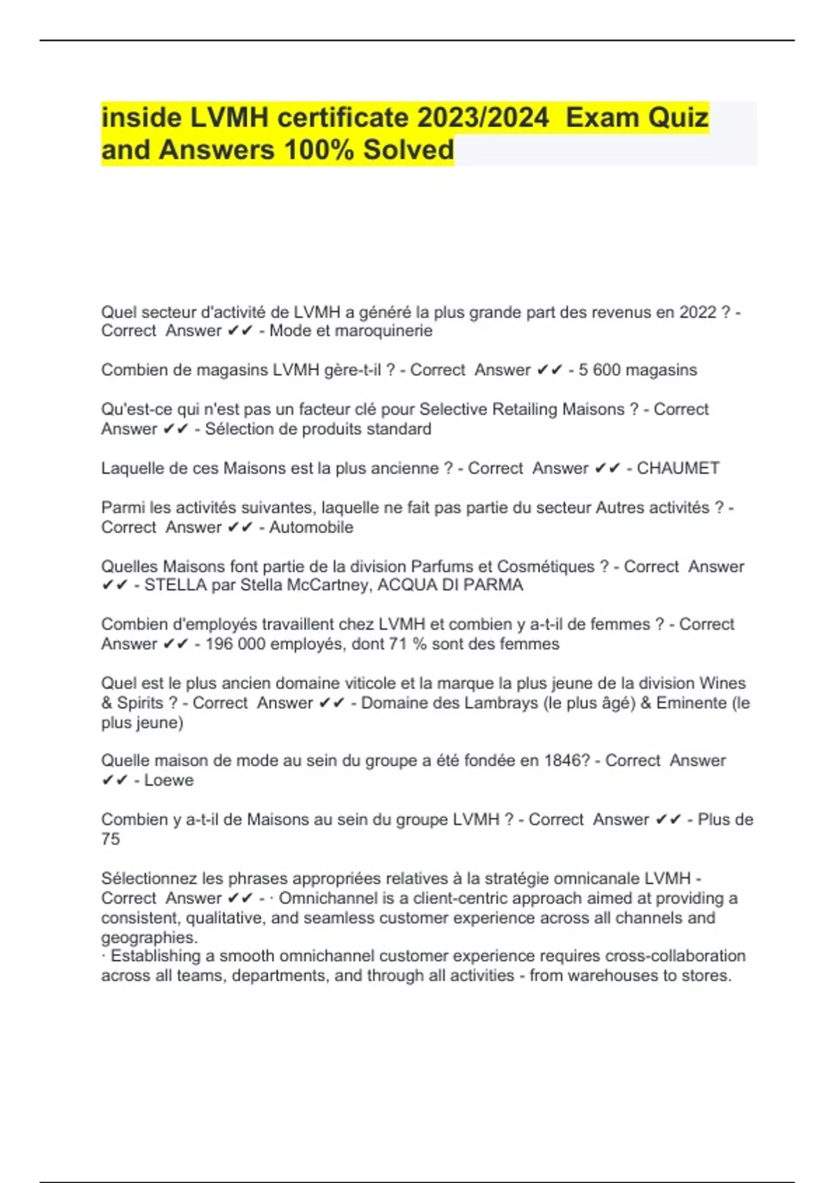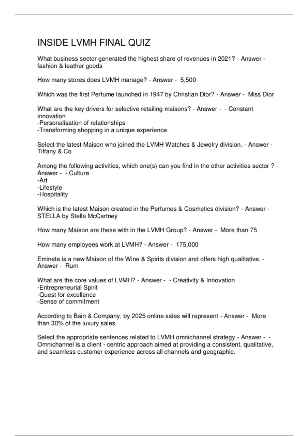 ANSWERS FIRST MODULE INSIDE LVMH CERTIFICATE OCTOBER 2023 Prove d