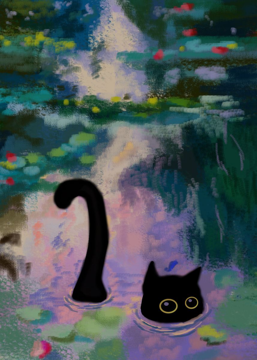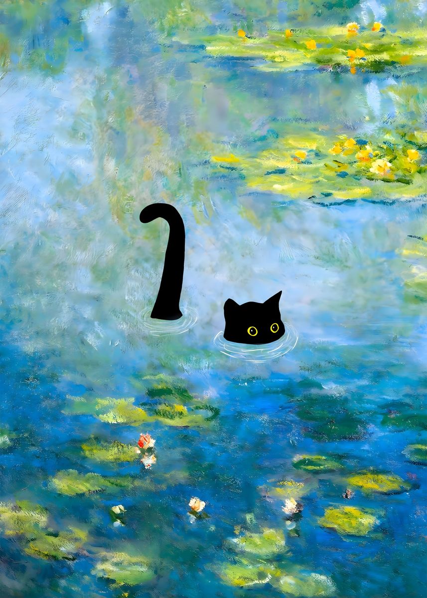 Monet Black Cat Art Monet Waterlily Cat Print Monet Cat Art Monet