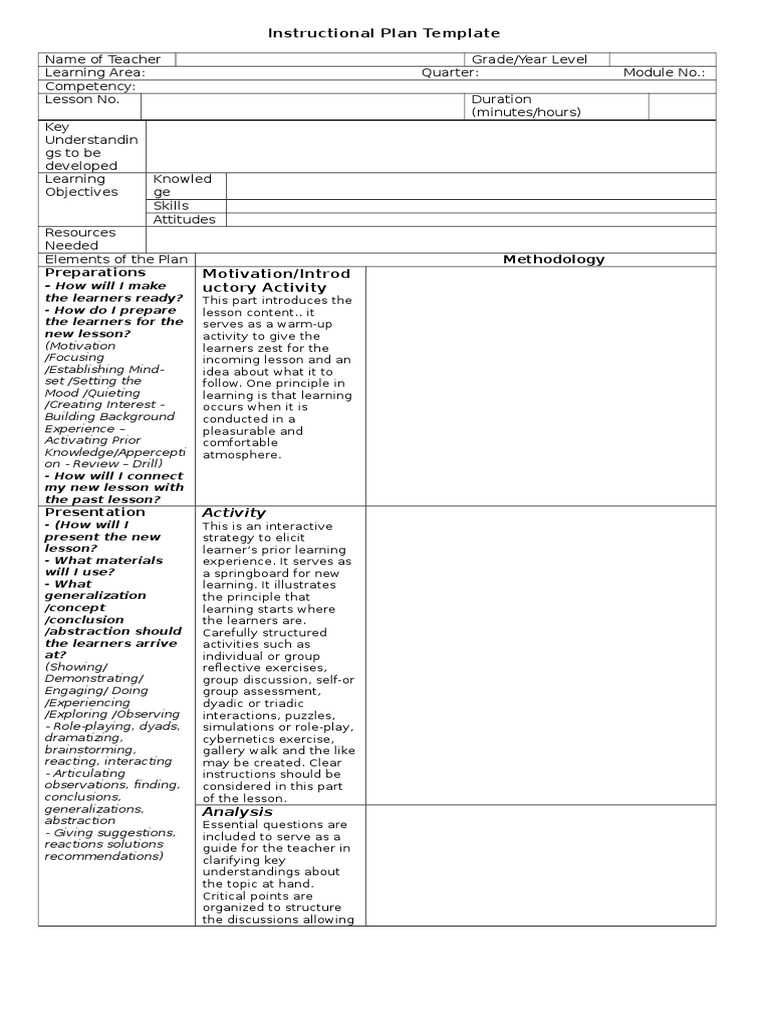 Instructional Plan Template: Methodology Preparations PDF Lesson