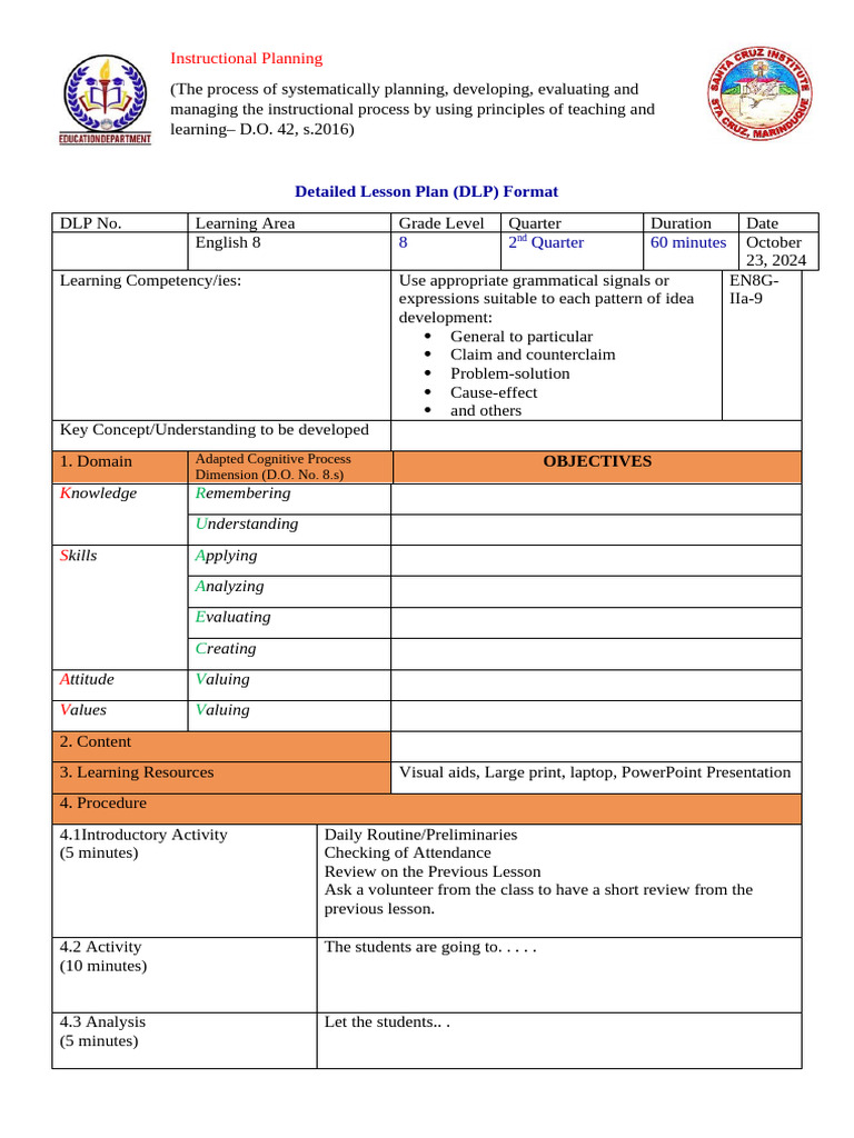 Instructional Plan PDF Learning Lesson Plan