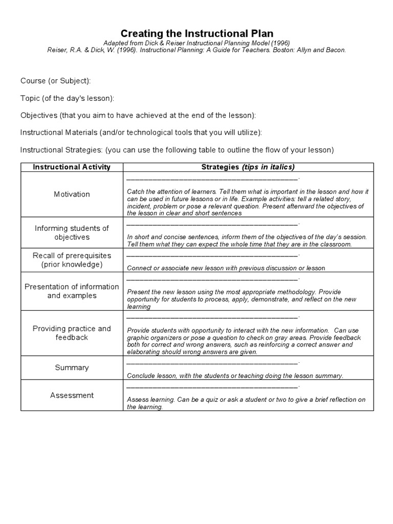 Creating The Instructional Plan Template 1 PDF Learning