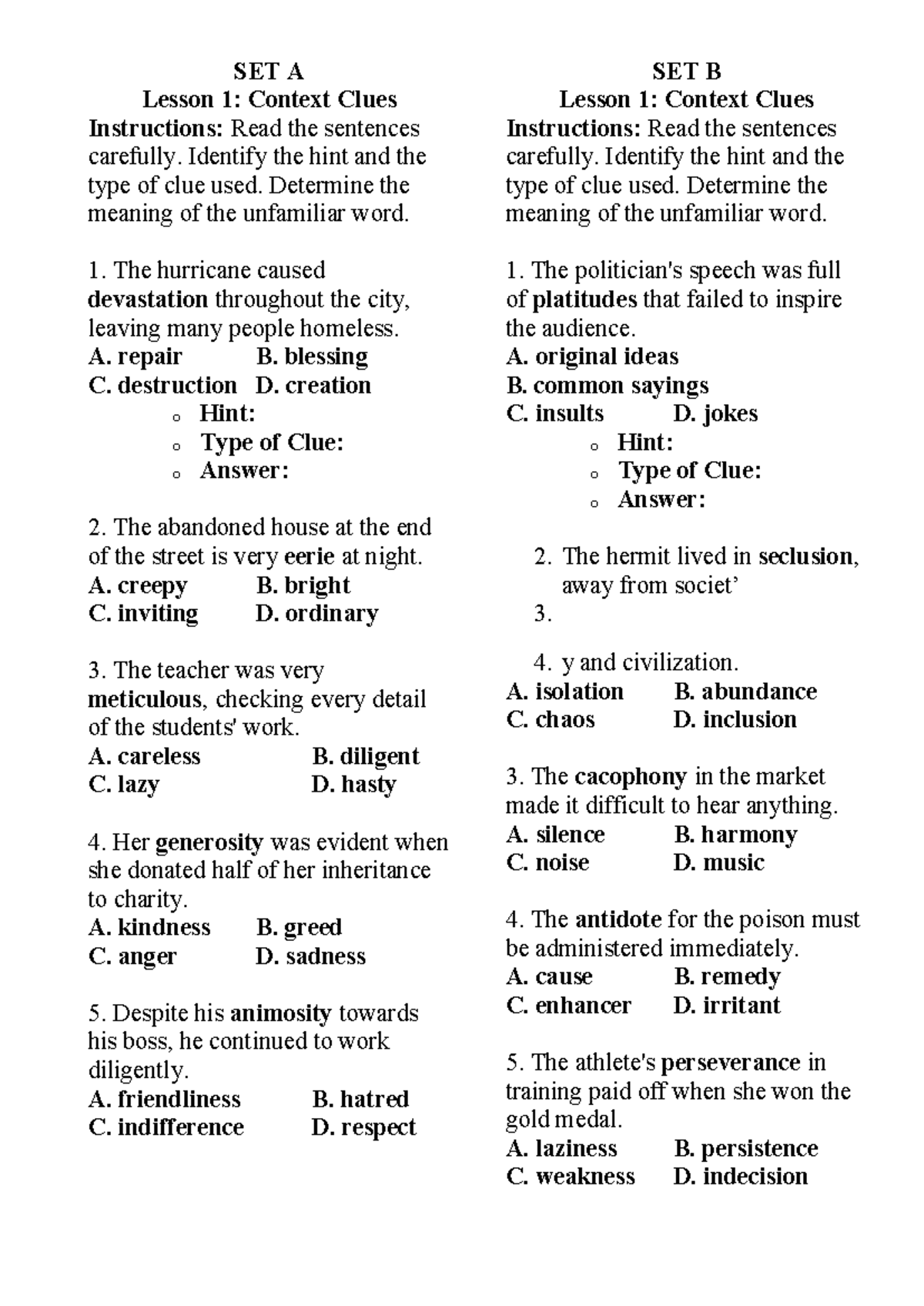 COntext clue quiz set a set b SET A Lesson 1: Context Clues