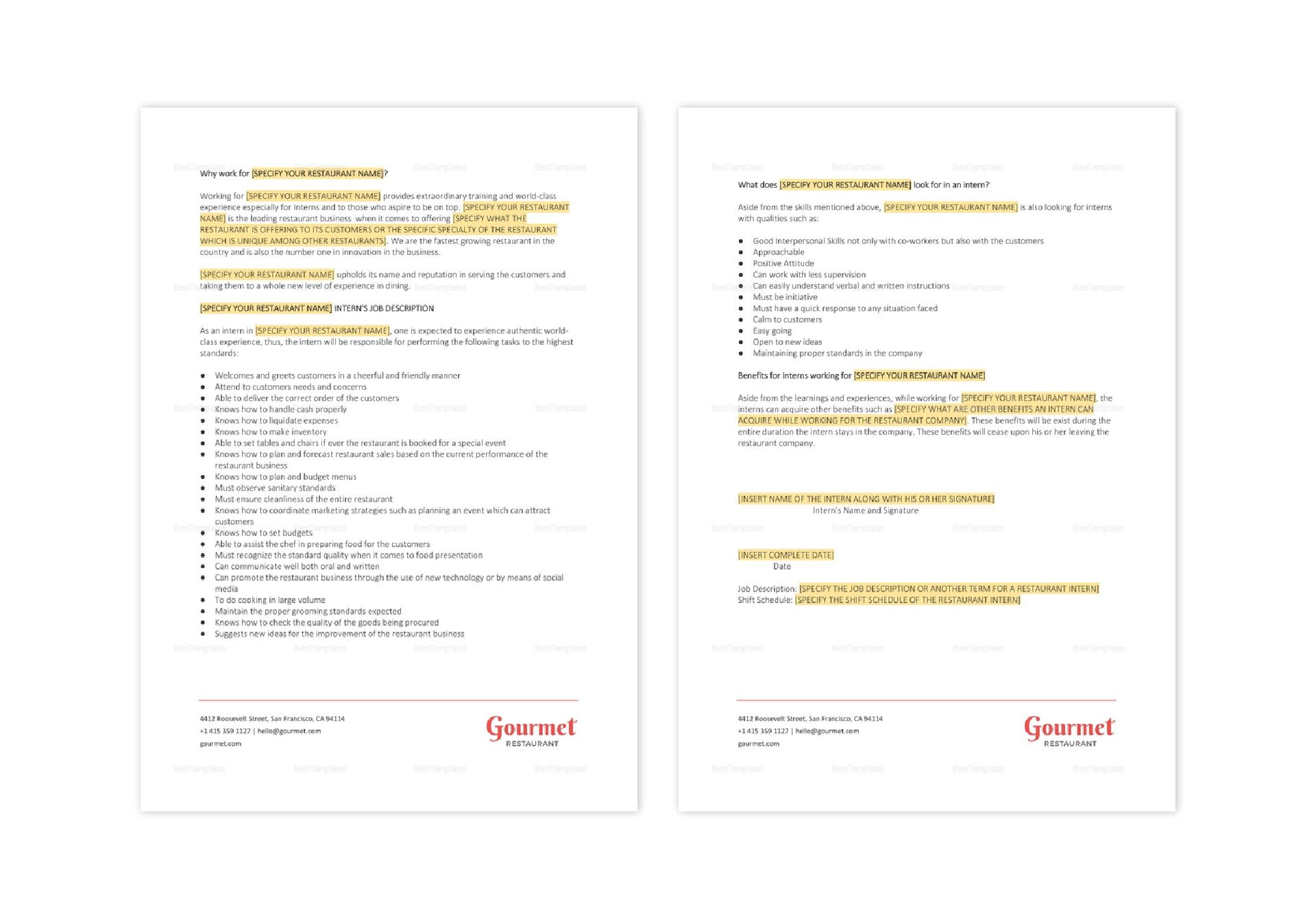 Restaurant Intern Job Description Template in Word Apple Pages
