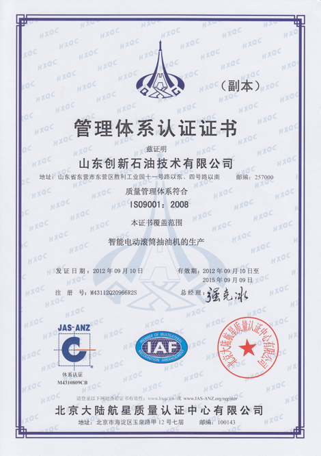 Shandong Chuangxin Petroleum Technology LLC Certificate